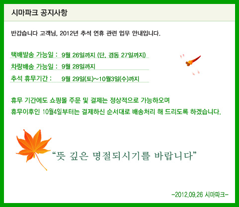 추석 연휴 관련 택배 발송 및 휴무 안내입니다.