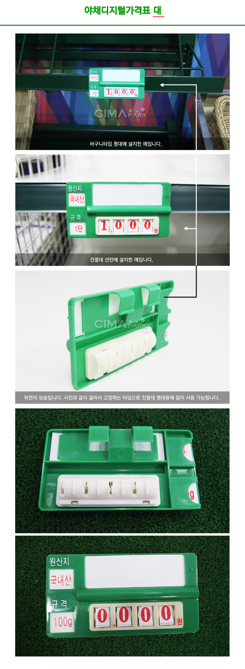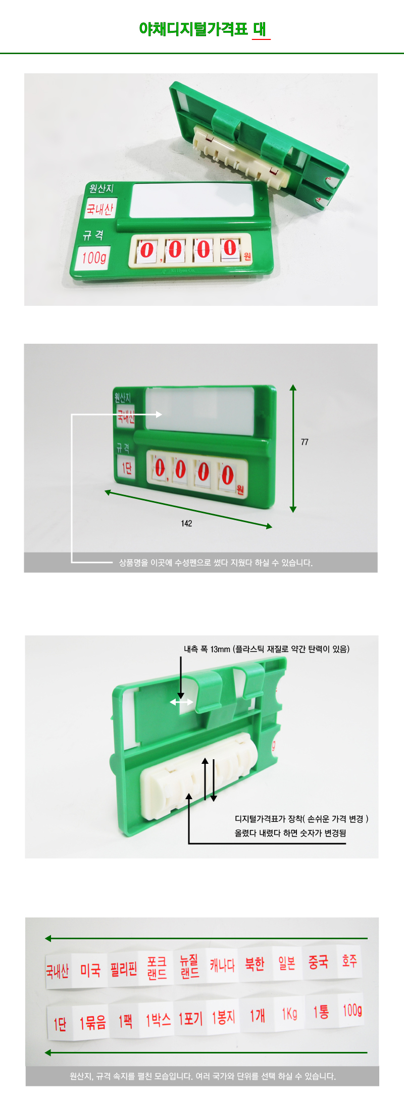 1. 가로 142 사이즈 소 사이지보다 좀 더 큰 사이즈입니다. (소사이즈는 가로 105) 2. 본 상품은 가격표시기로 주로 야채청과 코너에 많이 활용되고 있습니다. 2. 디지털 장착되어 있어 가격변동이 잦을 때 매우 유용하게 활용됩니다. 3. 원산지, 규격을 선택 하여 노출 하실 수 있으며 상단은 상품명을 썼다 지웠다는 반복하실 수 있습니다.
