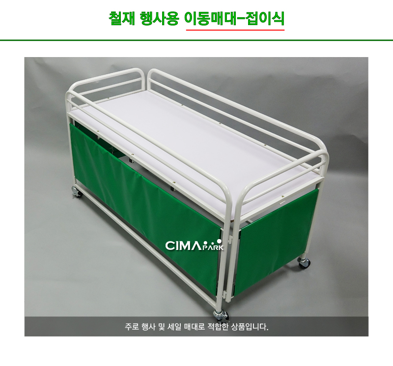 1. 주로 행사 및 세일에 사용되고 있는 매대입니다.2. 바퀴 장착으로 이동이 쉽고 접이식 상태로 보관 가능합니다.3. 3면이 밀폐이며 1면은 오픈으로 되어 있습니다.4. 상단에는 상품 적재를 하단에는 재고 상품 적재로 사용하실 수 있습니다.