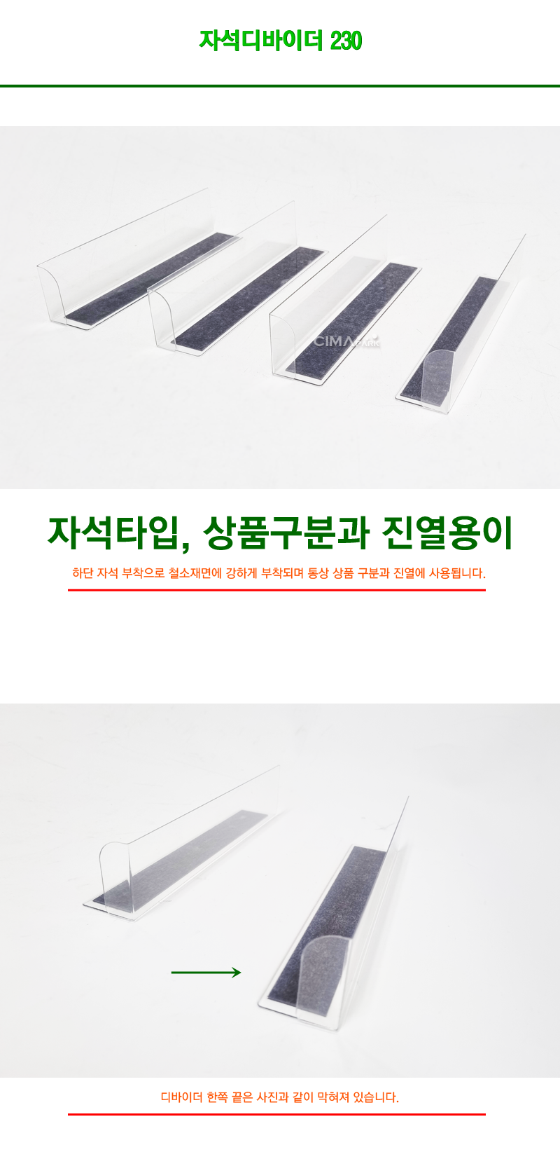 1. 상품 구분 및 진열에 용이하게 사용되는 디바이더입니다.2. 하단 자석 부착으로 철소재면에 고정 가능합니다.3. 자석타입으로 진열시 좌우폭은 언제든지 자유롭게 조절 가능 합니다.