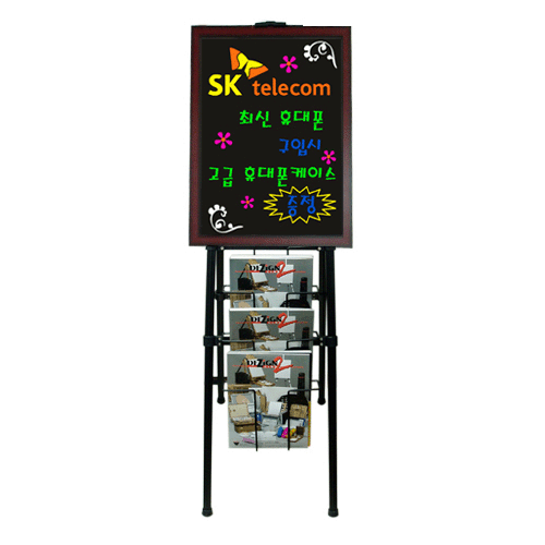 기업의 이미지와 비전을 제시하기 위한 대외 홍보용 카다로그 스탠드입니다. 앞면에 카다로그(브로셔)를 진열하실수 있으며 위(Top) 부분에 블랙보드를 장착하여 보다 화려하게 상품의 광고효과를 전달할 수 있습니다. 각종매장 및 전시장의 실내조명과 어우려져 매우 고급스럽고 연출이 가능합니다.