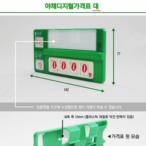 상품특징 디지털 장착으로 가격변동이 잦은 상품의 적합한 상품으로 주로 야채코너에서 많이 사용됩니다. (뒷쪽 부분을 올렸다 내렸다 하시면 숫자가 1>2>3>4 이러식으로 변경됩니다.)