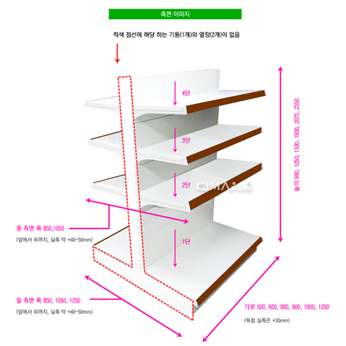 상품특징 하이퍼 중앙 연결형으로 단독 설치가 되지 않으며 이미 세워진 하이퍼 진열대에 이어서 설치하는 경우에 해당됩니다.