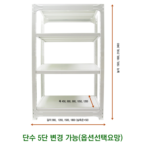 상품특징 가로 1200(약 실측1250), 앞뒤폭 450, 높이 1800~2400 선택 가능, 독립형으로 단독설치 가능, 선반 기본 4단, 선반 추가 가능, 중화물 적재적합