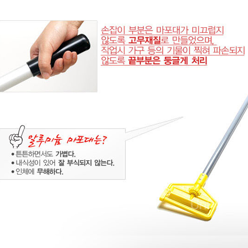 상품특징 러버메이트 제품에만 사용하는 봉입니다. 걸레를 쉽고 효율적으로 분리, 교체하는 사이드 게이트 방식입니다. 튼튼하고 가벼운 알루미늄 재질의 마포대입니다.
