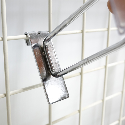 상품특징 메쉬망에 걸어서 사용되는 망용후크입니다. 1선과 달리 걸이 위쪽에 스윙홀더가 부착되어 있어 상품명, 가격 또는 광고물 부착이 가능한 2선 메쉬 후크입니다.