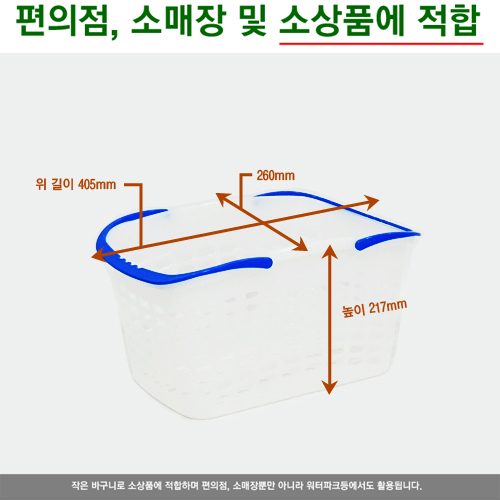 상품특징 본 바구니는 부피가 작은 상품, 소매장, 편의점등에 적합하며 워터파크, 사우나등에서도 사용됩니다.
